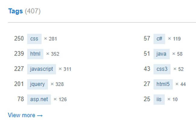 Notice, that my reputations are more for the tags such as CSS, jQuery and then for Java (see the upvote-to-post ratio). This somehow relates my profile to be a Frontend Developer. Now look at the C# Corner profile,