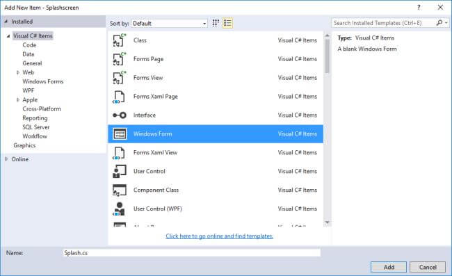 Add another form that will be used as the splash screen for this project, as in the following.