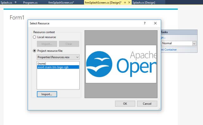 Add a picture box to the frmSplashScreen.cs form using the toolbox. Actually, I am using an image for the splash screen (you can try something different). Import the file and save it.
