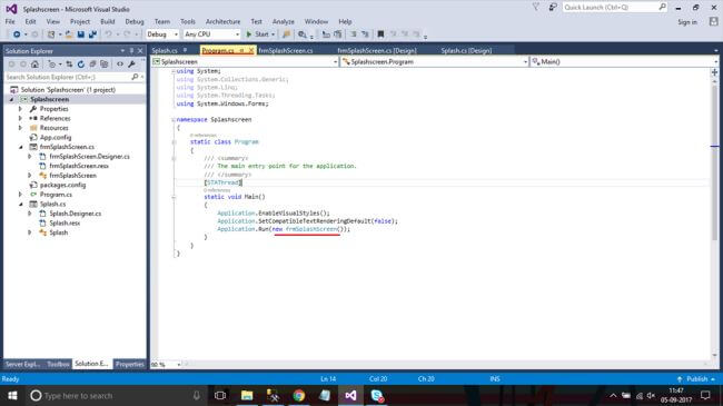 Go to Program.cs form and write the following C# code. Change the application run form name as new frmsplashscreen() as shown below.
