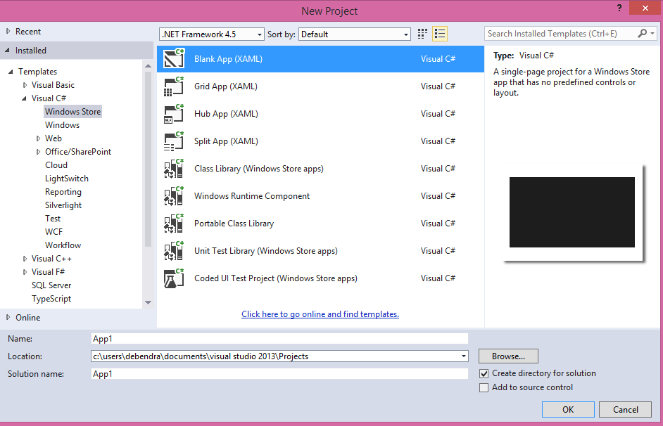 Here, in this application, I will show you how to develop Windows store apps in Windows 8 and how to test them using the local machine and a simulator. To create a project, open your Visual Studio and create a new project of the type shown below: