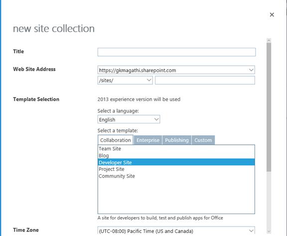If you have an Office 365 Small Business subscription, it supports only a single site collection, and so you can’t create a Developer Site collection.