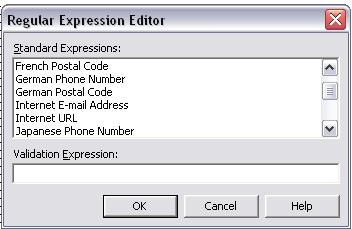 This control is used to verify the accuracy of strings using special characters. It will check for the specific pattern which should match with the code. You have to specify a regular expression using ValidationExpression property. The usage of this control is little complicated as compared to the above discussed controls. For example, you can verify whether a user has entered @ while inputting their e-mail address. It would be good if you have Visual Studio .NET 2003 to work with this control as it will automatically fulfill the coding part. The development environment comes with a Regular Expression Editor which will give you the corresponding code for various tasks such as expressions for Internet E-mail Address, Internet URL, US Zip Code and much more (See the figure given below)