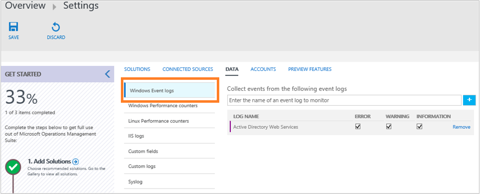 Add logs- Configure at least one data source to populate our data and select Save. For event logs, we can specify the type of messages including an error, a warning, and information to monitor.