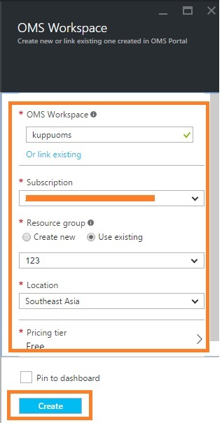 In the Log Analytics blade, select OMS Workspace Name, Subscription, Resource group, Location, Pricing tier and click create button.
