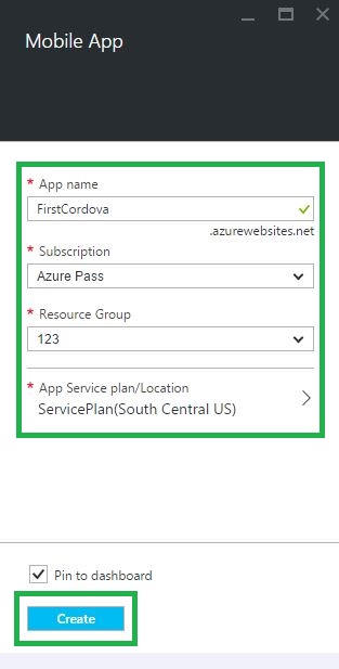 In the Mobile App account blade, specify the desired configuration for the Mobile App account (Name, & Resource Group). Click Create button at the bottom of the screen to create the Mobile App.