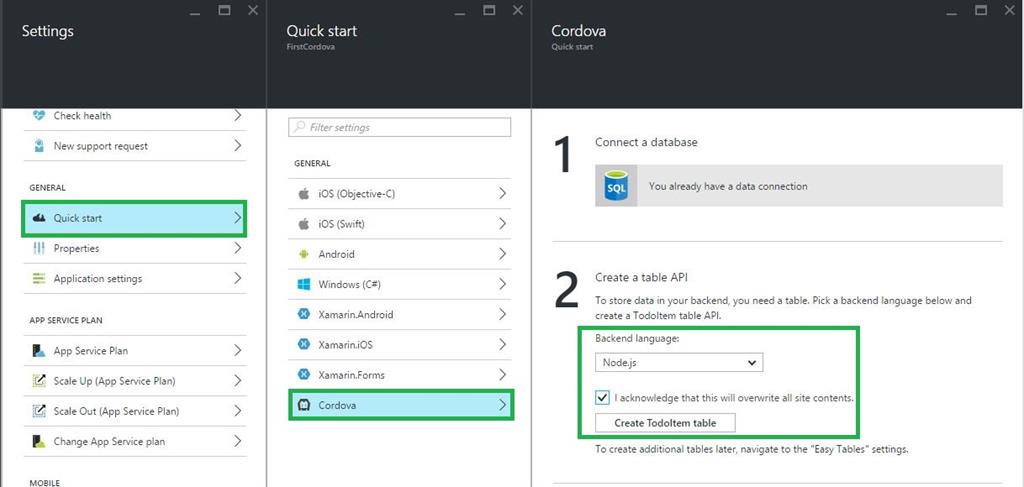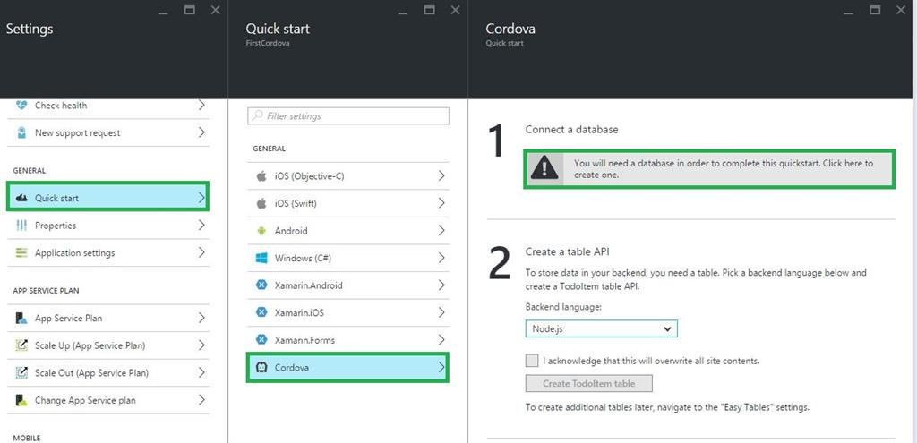 Step 4: In the Settings blade for the new Mobile App backend, click Quick start > your client app platform (Cordova), then Connect a database,