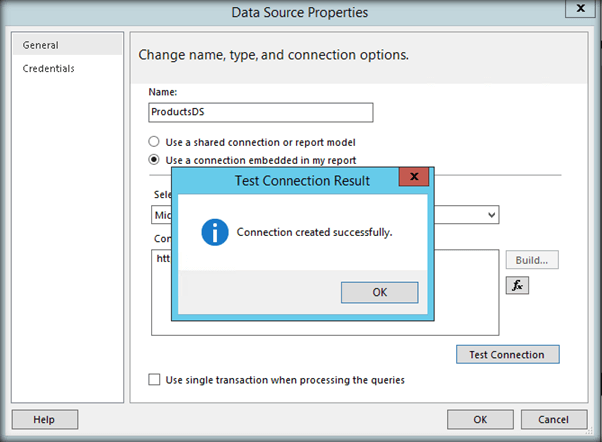 Specify the name for the data source and select ‘Use a connection embedded in my report’. From the connection type, select ‘Microsoft SharePoint List’.