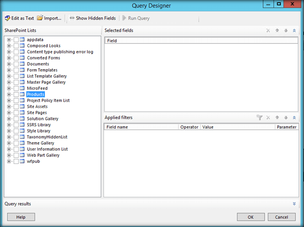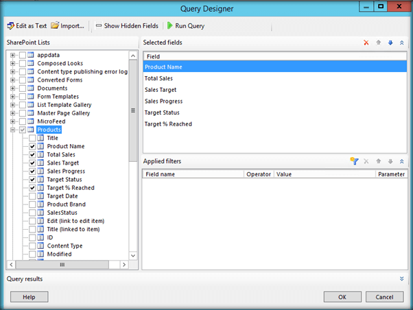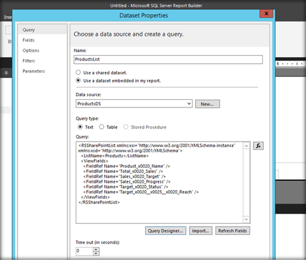 Click on OK. This will add the fields to the dataset and the CAML query for the same can be found in the dataset properties.