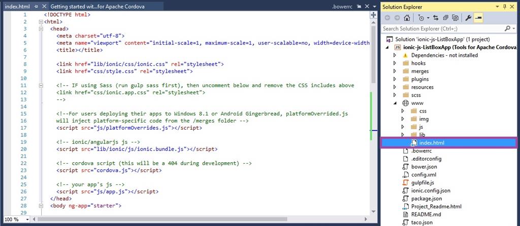 Go to the solution bar and choose the index.html. This is the Starting Screen of your App. We can add our HTML coding here.