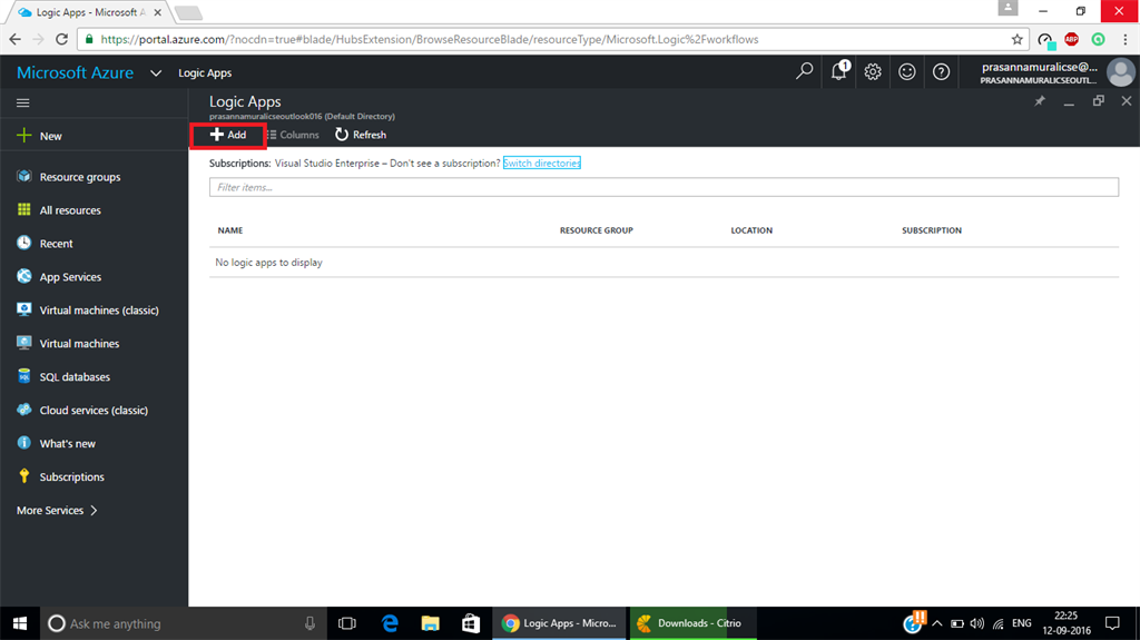 Step 3- In the Logic Apps blade, click Add button. If you don’t find your subscription, click the refresh option.