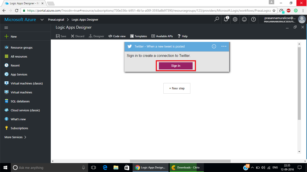 Step 7- If we add the Twitter API in our designer window, it automatically shows the “Sign In” option.