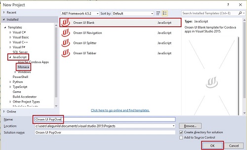 "New Project" window will open. Subsequently, you can select an Installed -> Template -> JavaScript -> Manoca ->Onsen UI Blank app.