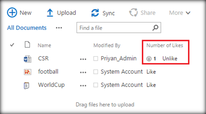 Once the selection has been made, click OK. Now, let's head back to the document library. Like feature has been enabled in this list. This will add a new column “Number of Likes” to the library. Clicking Like button will add a like to the document. A user can like the content only once.