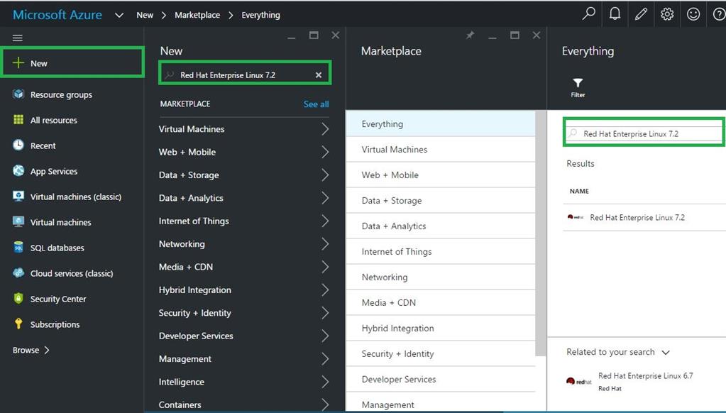 Step 2: In the Jumpbar, click New, then Search for Red Hat Enterprise, and then click Red Hat Enterprise 7.2.