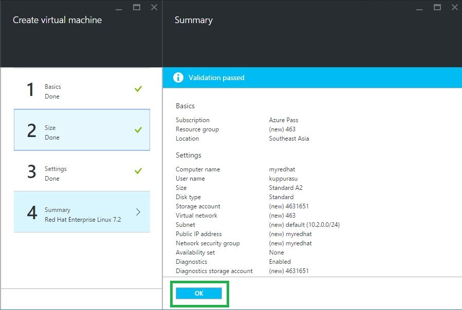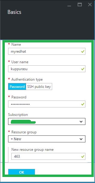In the Virtual Machine account blade, specify the desired configuration for the VM account (Name, User Name, Password & Resource Group). Click Create button at the bottom of the screen to create the Virtual Machine.