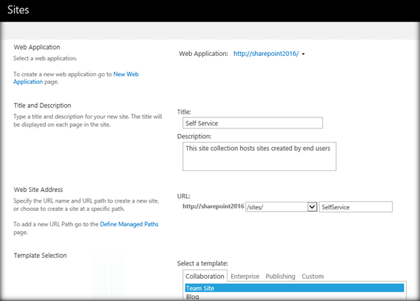This will enable the self-service site creation service in SharePoint 2016 web application.