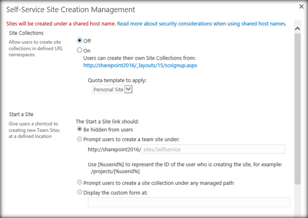 Change the radio button to ‘On’ and select the option ‘Prompt users to create a team site under’. Also, mention the managed path under which the site collections will be created. I have mentioned it as “sites/SelfService”. You can also select the option ‘Prompt users to create a site collection under any managed path”. However, this would lead to a situation where users can create site collections randomly within the web application and over time, it can spin out of control. It is always better to restrict the users to create site collections under a specific managed path.