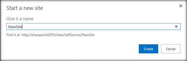 This will open up the self-service site creation dialog box where we can specify the new site collection name. It will be created under the already specified managed path (sites/SelfService).