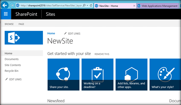 Thus, a new site collection by the name ‘NewSite’ has been created.