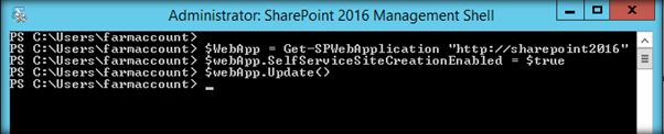We can also enable the self-service site creation feature through PowerShell. Spin up the SharePoint 2016 Management Shell.