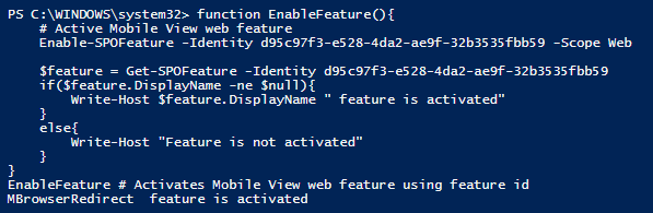 - Enable-SPOFeature -Identity d95c97f3-e528-4da2-ae9f-32b3535fbb59 -Scope Web