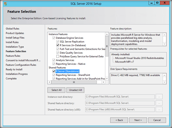 From the feature selection option, select ‘R Services (In-Database)’.