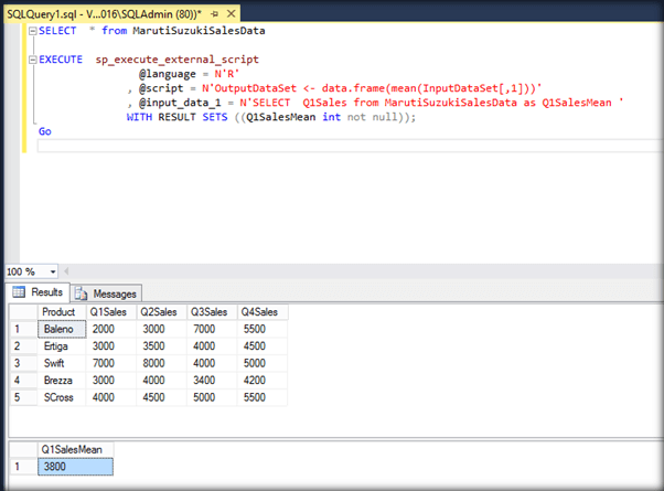 As part of the first script we will be using R Script to get the mean value of total sales in Q1. We will use the Select statement to get the table data into ‘@input_data_1’. Then the R Script ‘N'OutputDataSet <- data.frame(mean(InputDataSet[,1]))’ will be applied on the input data. Mean function will get the average of the column values which will be displayed as ‘Q1SalesMean’ which is specified in the ‘RESULT SETS’ section.