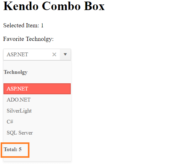 Use this template if you need to add the header to the kendo combo box list items. To define a header template, nest an <ng-template> tag with a kendoComboBoxHeaderTemplate directive inside a <kendo-combobox> tag.