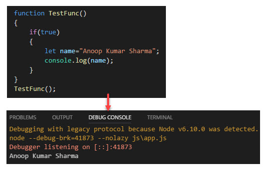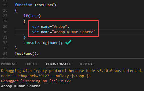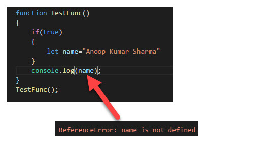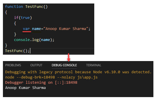 In the example mentioned above, we declared name variable in if condition, but we are able to access the same variable out of the if condition because var is globally available in a function block.