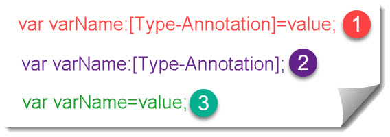 In the image given above, the first syntax is with type-annotation as well as value. The second syntax is with type-annotation, but no value (have undefined value) and third syntax is without the type-annotation but has the value.