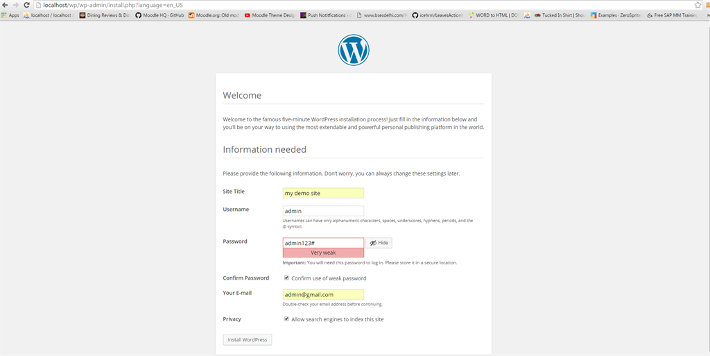 Click Run the install buttonand the next screen will show personal details like site name and admin information please fill information and click install wordpress button.