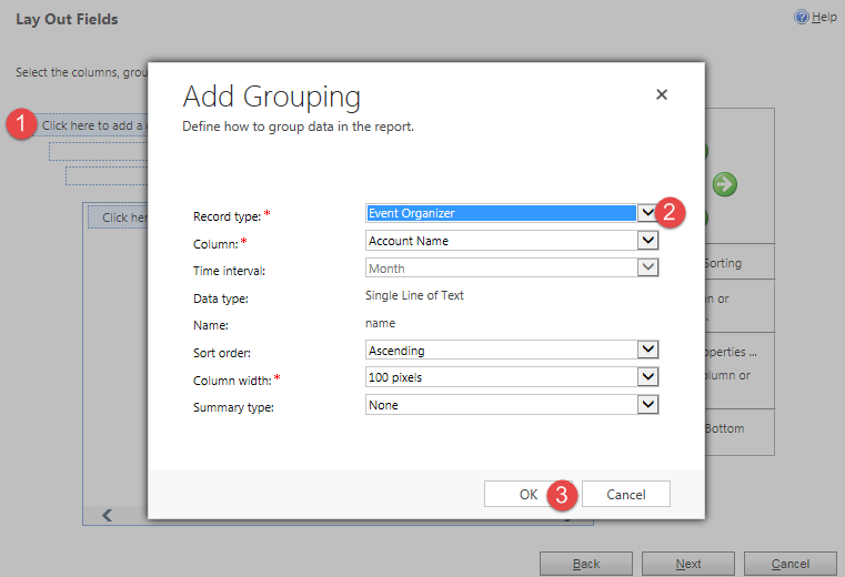 - As we need to display the events group by event organizer, we will click top option to Add Grouping, based on the event organizer, like the following-