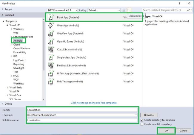 Open Visual Studio->New Project->Templates->Visual C#->Android->Blank app.