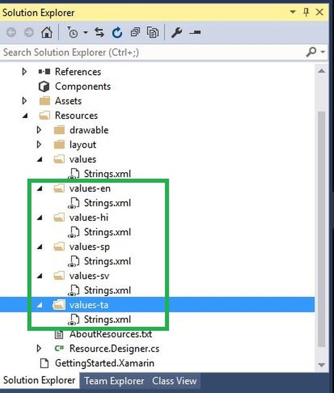 Open Solution Explorer-> Project Name-> Resources. Create values folder for the various languages. Here, I created English, Tamil, Hindi, Spanish, Swedish.