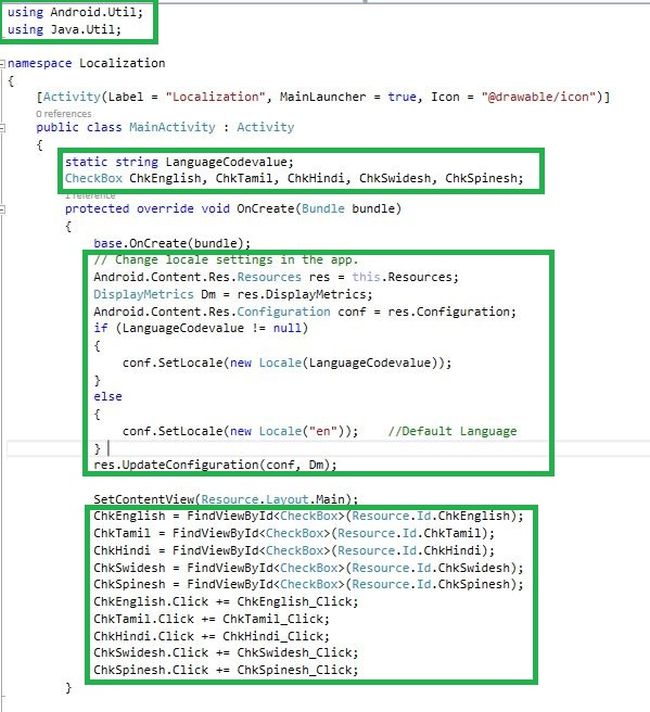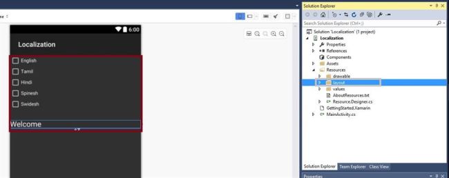 Open Solution Explorer-> Project Name-> Resources-> Layout-> Main.axml. Design the page for the language changes options. Here, I created Check box and textview.