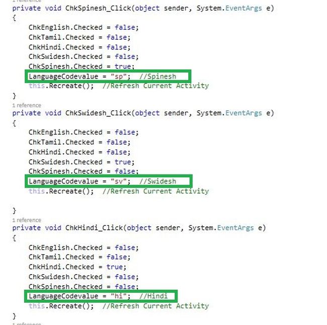 - <CheckBox>(Resource.Id.ChkSpinesh); ChkEnglish.Click += ChkEnglish_Click; ChkTamil.Click += ChkTamil_Click; ChkHindi.Click += ChkHindi_Click; ChkSwidesh.Click += ChkSwidesh_Click; ChkSpinesh.Click += ChkSpinesh_Click; }
