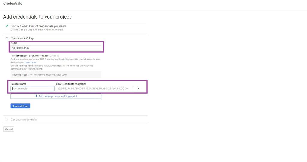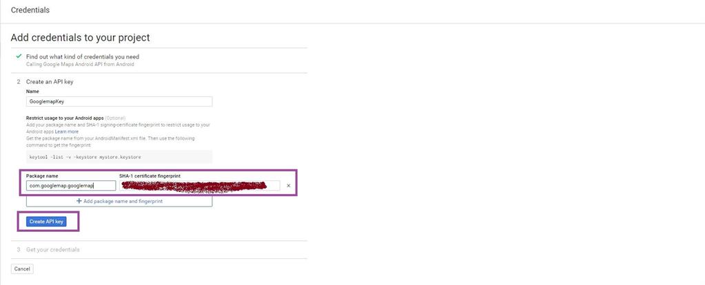 Step 8: Next Windows is showing Create as API Key to Give your Project name and Click Add Package name and fingerprint button,