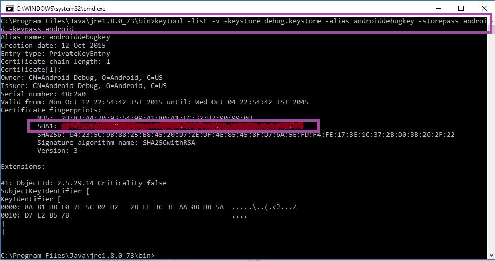 keytool -list -v -keystore debug.keystore -alias androiddebugkey -storepass android -keypass android Next to Press Enter Button that time will create SHA1 KEY,