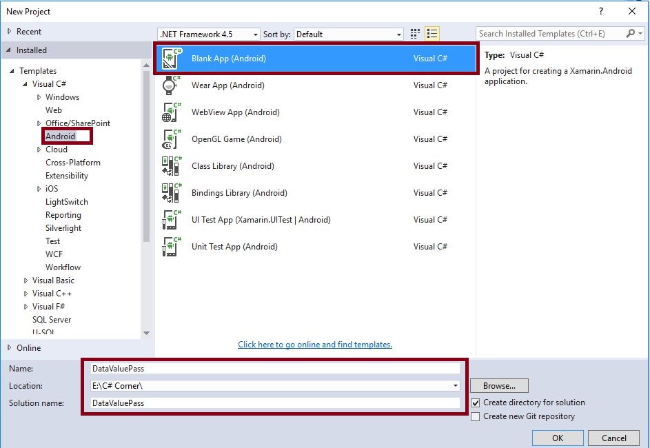 Step 1 - Open Visual Studio, New Project, Templates, Visual C#, Android, Blank App, then select Blank App. Give Project Name and Project Location.