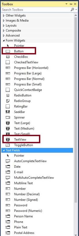 Step 9 - Select Toolbar Drag and Drop, Button and TextView.