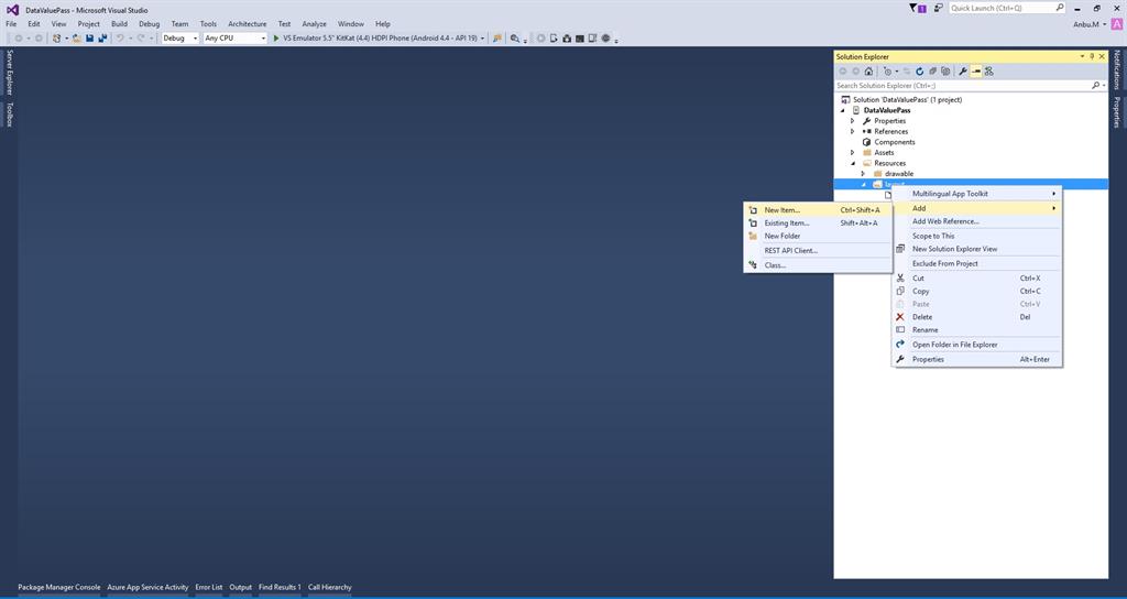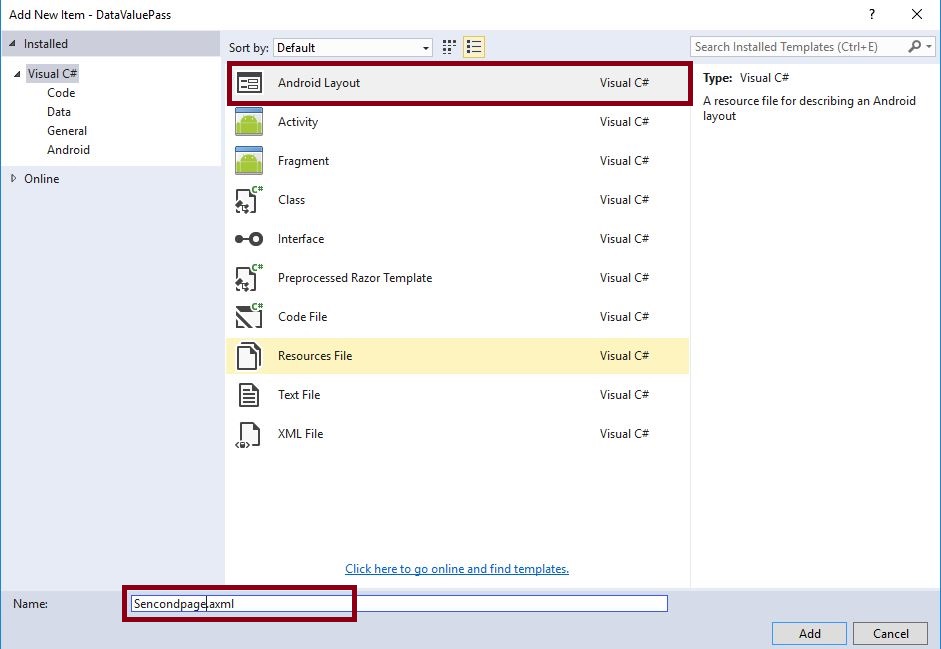 Next we need to create Second page, so go to Solution Explorer, Project Name, Resources, layout. After that right click on Add->New Item, then open new Dialog box.