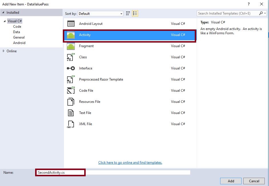 Step 5 - Then select Activity and give name it SecondActivity.cs.