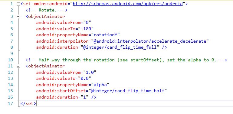 Step 7: Open Solution Explorer-> Project Name-> Resources-> Anim -> card_flip_left_in.xml. Click to open and add the code, given below:
