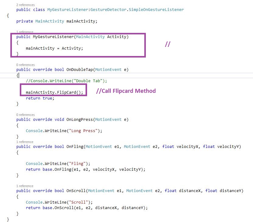 Step 13: Open MainActivity.cs page, below OnCreate(), create a new class for FlipCard.