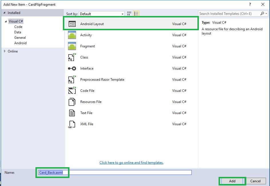 Step 2: Create Card_Back.axml page. Go to Solution Explorer-> Project Name-> Resources-> Layout. Right click to Add-> New Item and open the new dialog box.