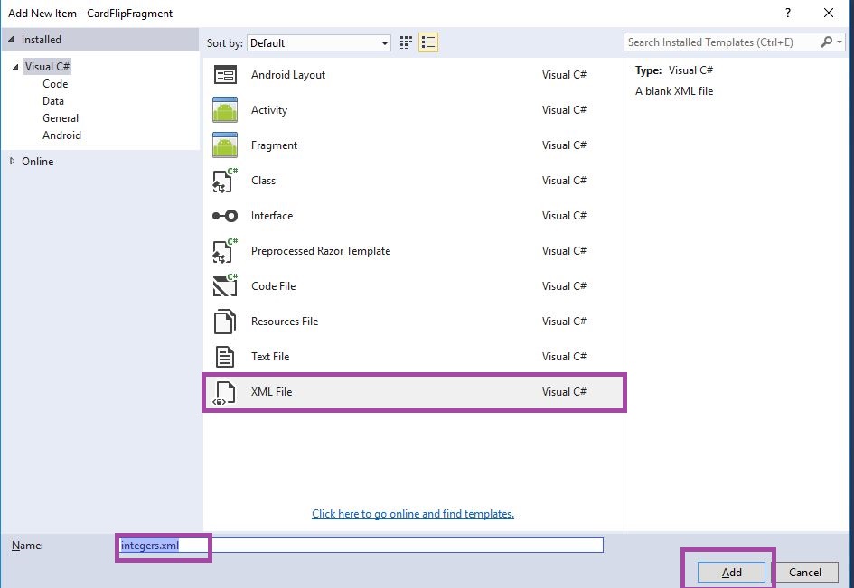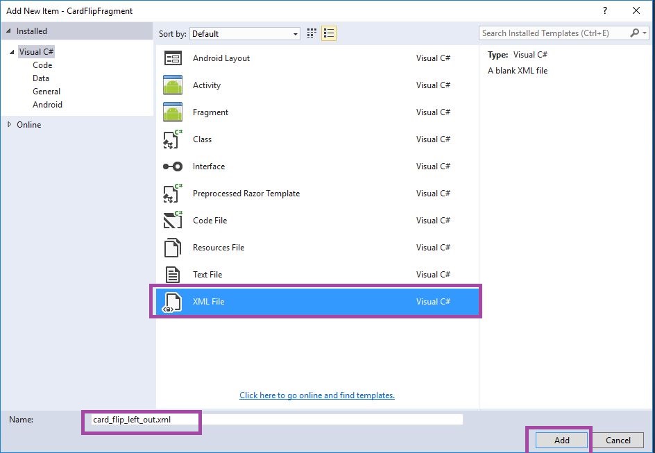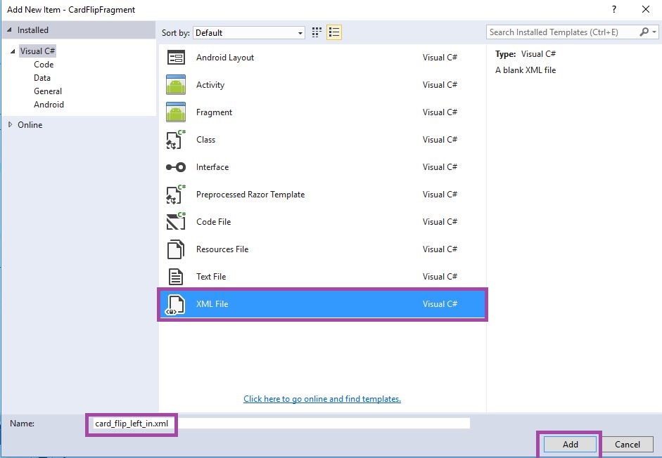 Step 5: Here, we will create four animations. Thus, we create XML resource. Go to Solution Explorer-> Project Name-> Resources-> Anim. Right click to Add-> New Item and open a new dialog box. This dialog box is required to select XML and give the name for Card_flip_left_in.xml, Card_flip_left_out.xml, Card_flip_right_in.xml and Card_flip_right_out.xml.