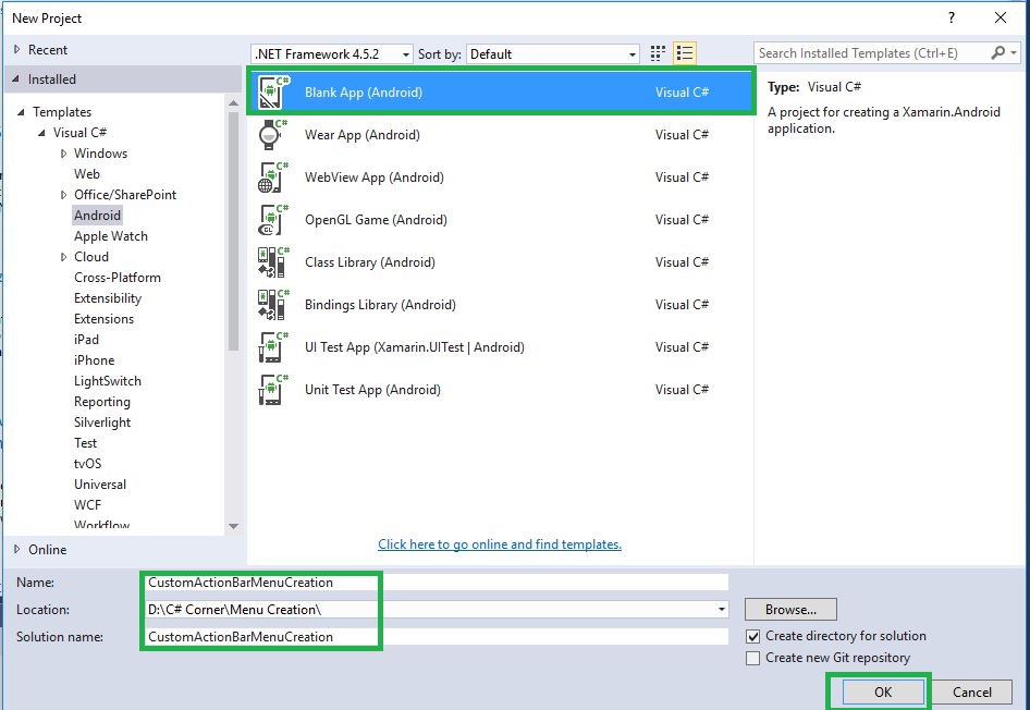 Step 1: Open Visual Studio ->New Project ->Templates ->Visual C# ->Android ->Blank App.