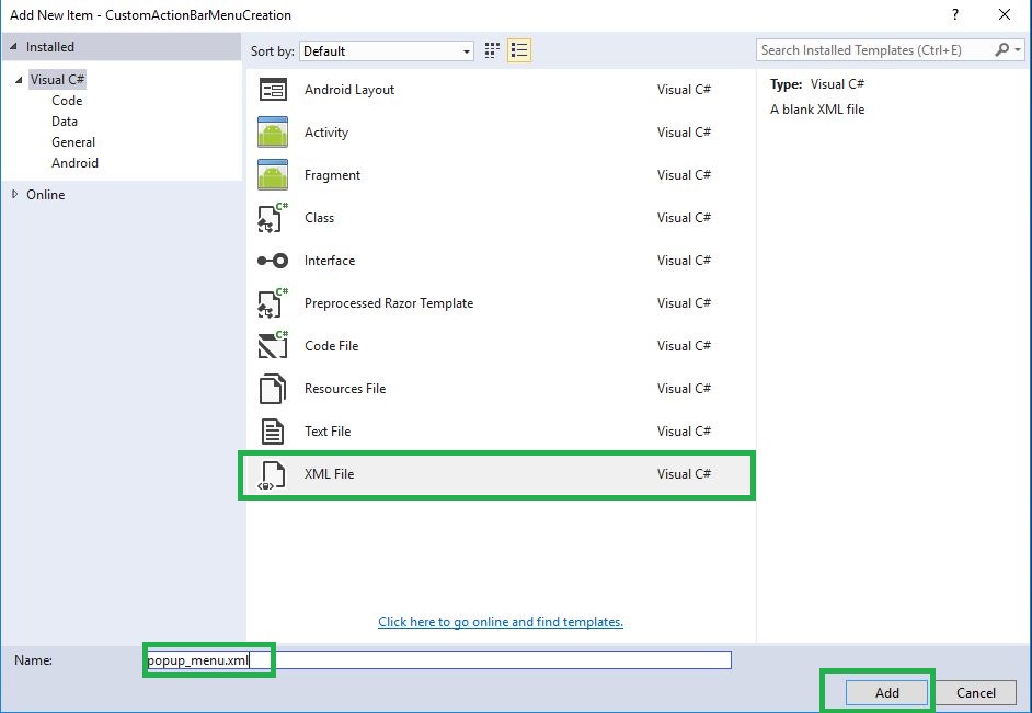 Step 2: Next, create options_menu.xml file. Go to Solution Explorer -> Project Name ->Resources ->values. Then, right click and go to Add->New Item. This opens a new dialog box. Select XML File and give it a name, as option_menu.xml.