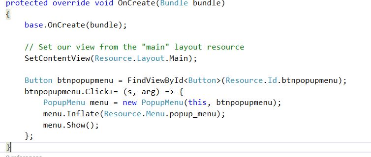 - Button btnpopupmenu = FindViewById < Button > (Resource.Id.btnpopupmenu);